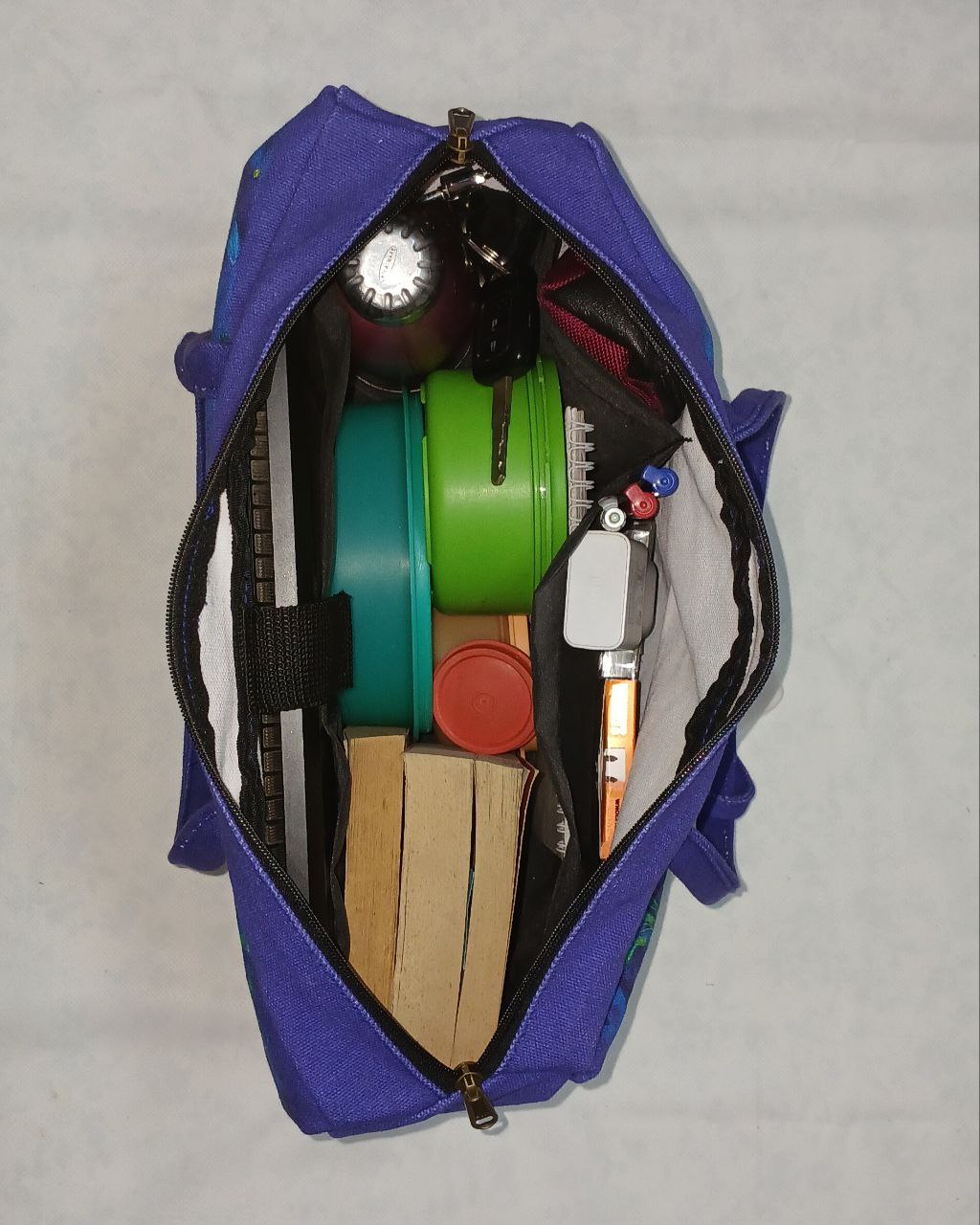 Crafted from sturdy canvas, this stylish tote features a serene blue background adorned with artistic fish motifs, evoking the imagery of flying fish gliding gracefully over the sea. Designed for both elegance and utility, it offers ample space to carry your laptop, water bottle, diary, chargers, edibles, books, and more—making it a perfect blend of functionality and charm for everyday use