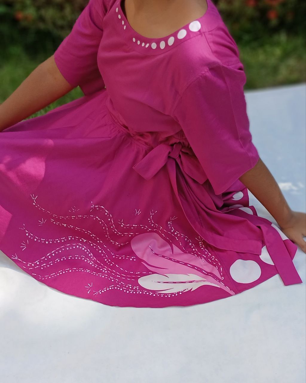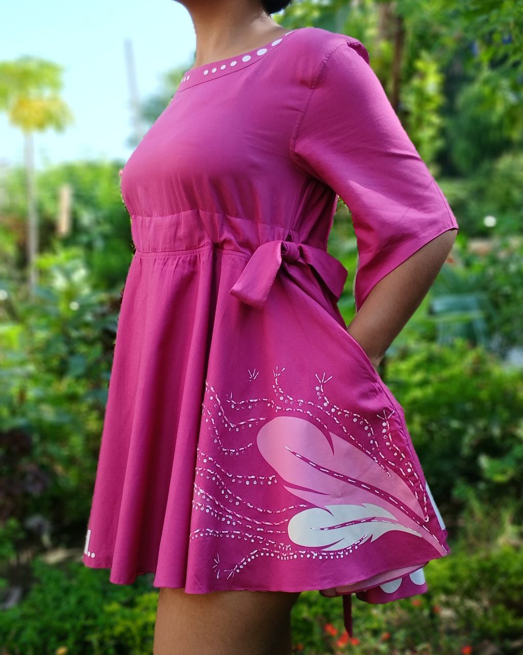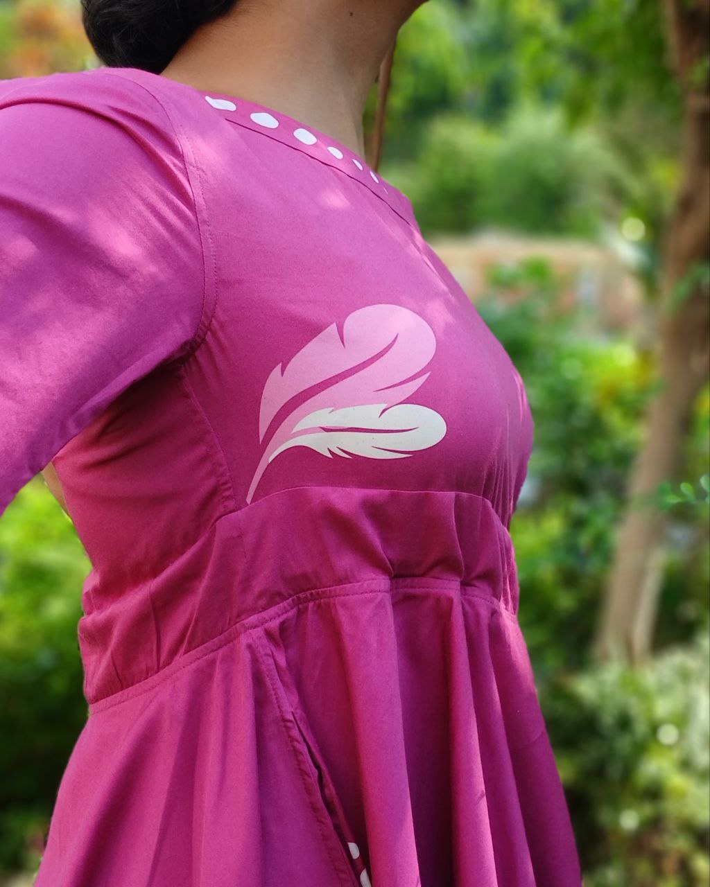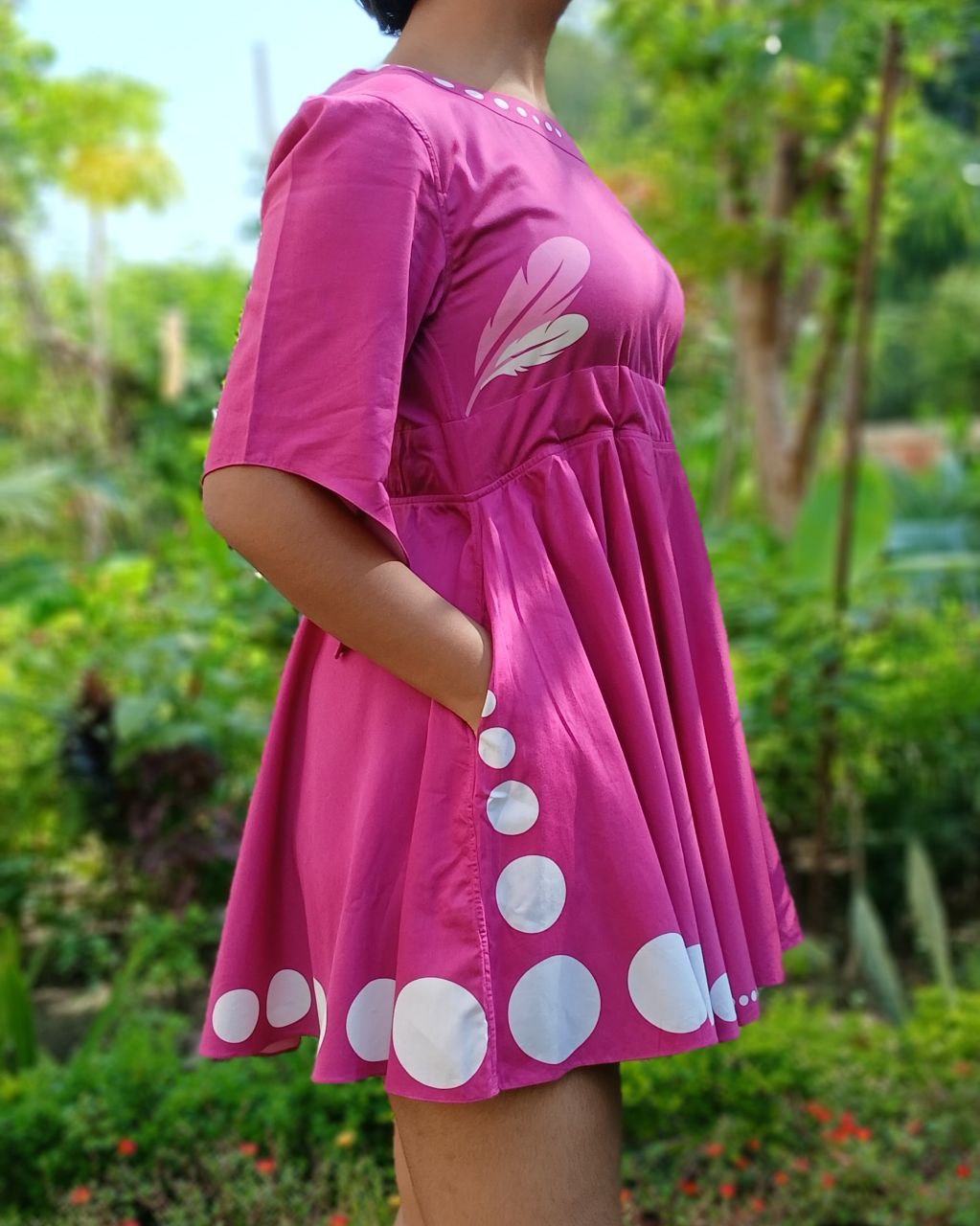 The Purple Plume dress is designed for the modern office-going woman who values comfort with elegance. Adorned with Feather Motifs inspired by free spirit and with playful White Polka Dots, it brings a touch of freshness to workwear. The flared sleeves and bottom add ease of movement, while the two pockets keep it functional and smart.